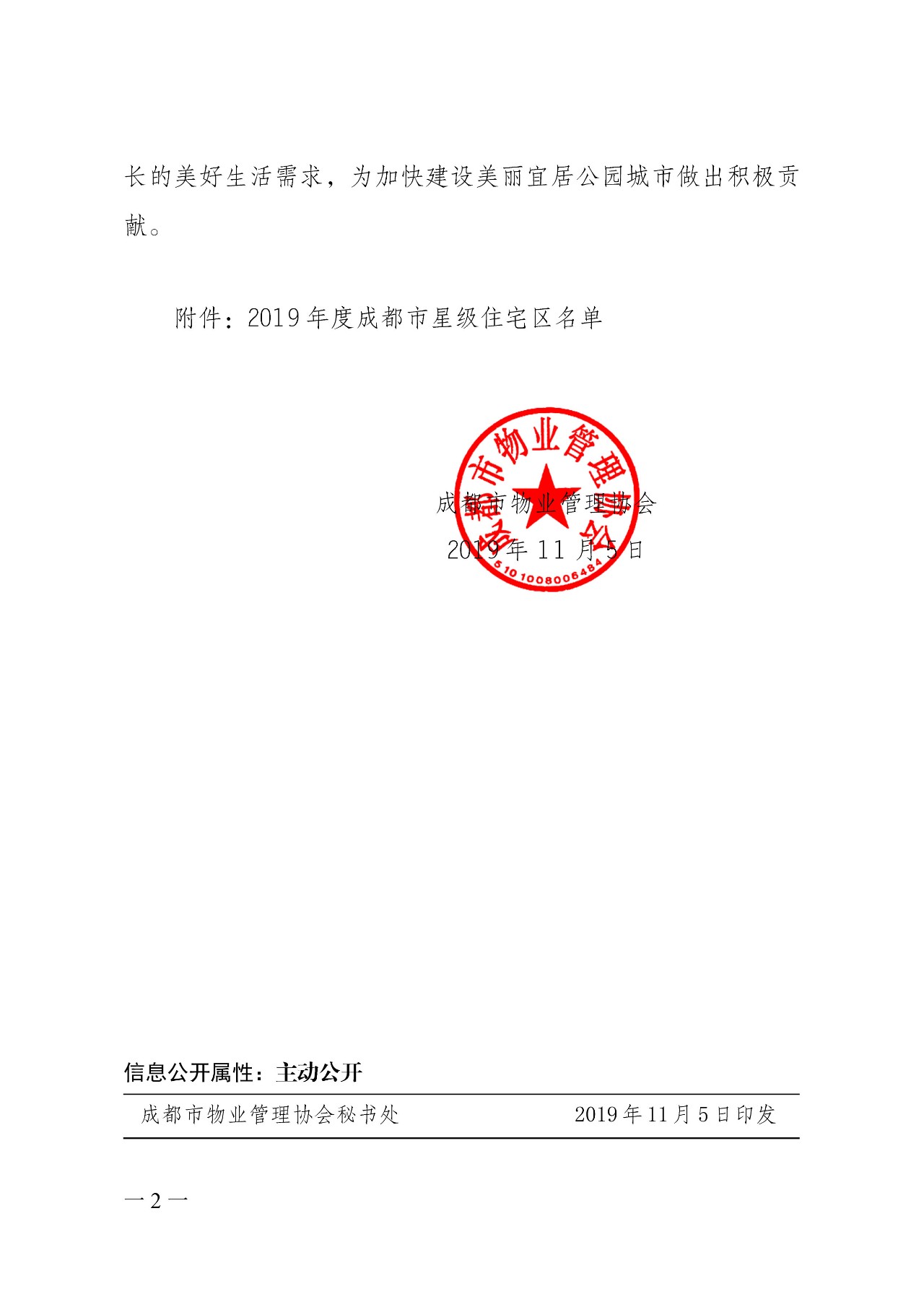 成都市物業(yè)管理協(xié)會(huì)組織開(kāi)展了2019年度星級(jí)住宅區(qū)創(chuàng)建活動(dòng),培育星級(jí)住宅區(qū)215個(gè)。